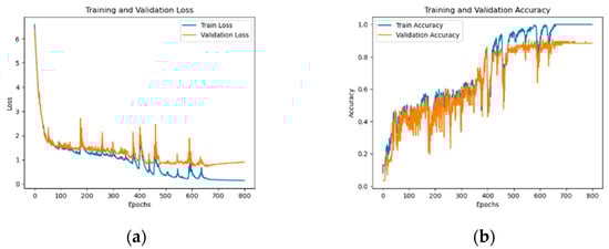 As can be seen from Figure 15, the accuracy rate steadily increases with the increase in iterations, while the loss rate gradually decreases and becomes stable. Specifically, the accuracy rate reached 0.8667 and the loss rate was 0.7260, indicating that our model training was successful.