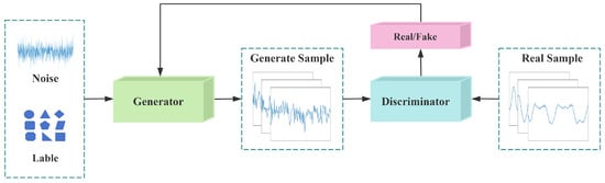 where is the discriminator D’s prediction of the labeled real samples, and denotes the discriminator D’s prediction of the false sample . The goal of the generator G is to learn and generate a new data distribution that is nearly similar to the true data distribution under the constraints of the category label y, the distribution of the random noise z is then mapped to through , thus generating new data to fool the discriminator D, which aims to deceive the discriminator by calculating the probability that the samples are from real data or generated data or , which measures the difference between the generated distribution and the true distribution distance between them, and instructs the generator to generate more realistic false samples.