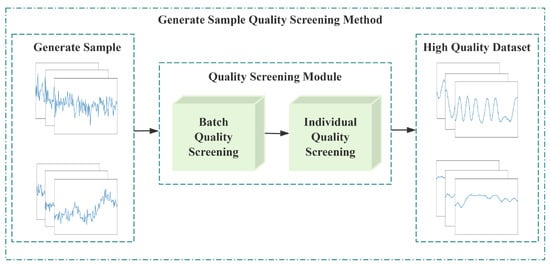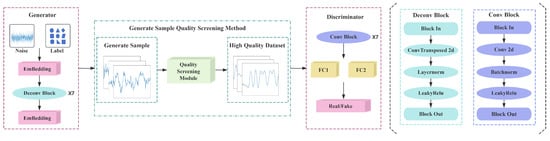 In order to improve the quality of the generated labeled samples, a generative sample quality screening method has been proposed. This method deviates from the conventional practice of fixed network weights in well-trained CGAN networks, instead adopting a parallel method of real-time updating of network weights and quality screening, and the schematic structure of the method is given in Figure 2.