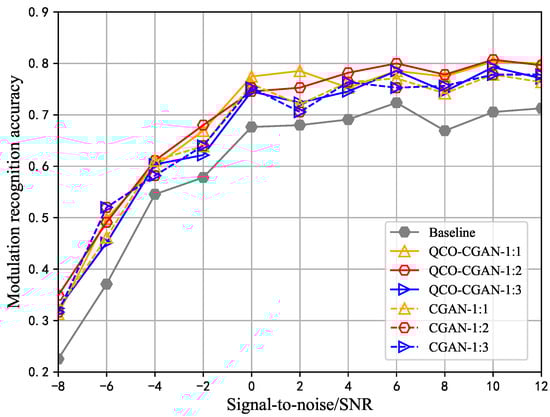 Figure 4 gives the recognition accuracy of the CGAN network with three different expansion ratios of −8∼12 dB, 1:1, 1:2, and 1:3 and two expansion methods, under the optimal model of the standard classifier for the modulation mode. It can be seen that the average recognition accuracy levels of the QCO-CGAN expanded with the quality screening method are improved by 2.02%, 2.24% and 0.89%, respectively, compared to that of the CGAN expanded with the general method under this experimental condition. Under different signal-to-noise ratios and these three different expansion ratios, QCO-CGAN showed a 1∼6% improvement in modulation recognition accuracy compared to CGAN.