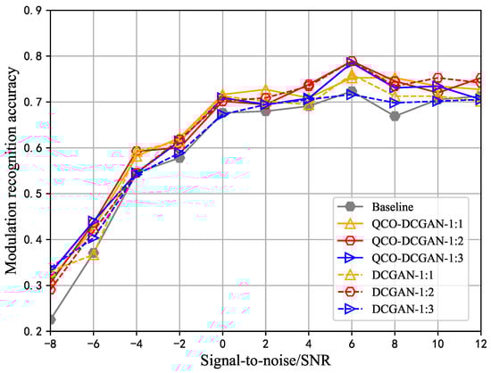 Figure 5 gives the recognition accuracy of the DCGAN network with three different expansion ratios of −8∼12 dB, 1:1, 1:2, and 1:3 and two expansion methods, under the optimal model of the standard classifier for the modulation mode. As can be seen from the figure, the average recognition accuracy levels of QCO-DCGAN expanded with the quality screening method are improved by 1.46%, 0.36%, and 2.08%, respectively, compared to DCGAN expanded with the general method under this experimental condition; the modulation recognition accuracy levels of QCO-DCGAN compared to DCGAN with different SNR and these three different expansion ratios are improved by 1∼6% improvement.