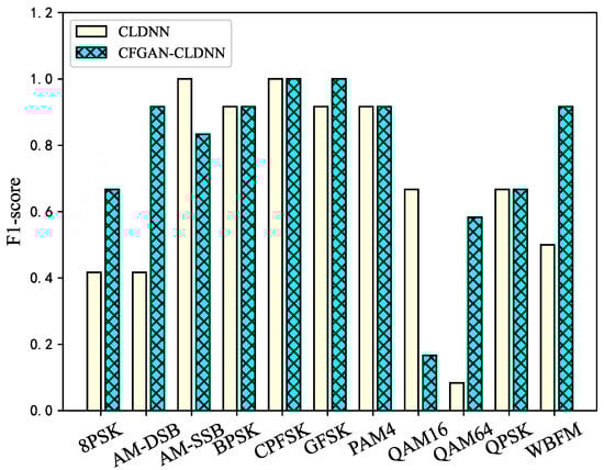 As can be seen in Figure 7 and Figure 8, compared to the CLDNN network, at 0 dB, the few-shot dataset expanded by the CFGAN network improves the F1-scores of the five modulations, 8PSK, AM-DSB, GFSK, QAM64, QPSK, and WBFM; at 12 dB, the F1-scores for six modulations, 8PSK, AM-DSB, GFSK, QAM64, QPSK and WBFM, are improved. Seven of the CFGAN network expanded dataset scores exceeded 0.8 at 0 dB, and six of the CFGAN network expanded dataset scores exceeded 0.8 at 12 dB, except when the AM-SSB signal scores were slightly below 0 dB.