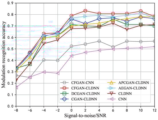 As can be seen from Figure 11, under the few-shot conditions, the average recognition accuracy of the CFGAN network proposed in this paper can reach 70.28% at −8∼12 dB. Compared with the CNN and CLDNN networks, the average recognition accuracy of the expanded CFGAN-CNN and CFGAN-CLDNN networks is improved by 6.71% and 10.48%, respectively. The expanded CFGAN network classified with the standard classifier CLDNN is improved by 3.61%, 7.54%, 5.24%, and 1.93%, respectively, compared to the expanded CGAN, DCGAN, APCGAN, and AEGAN networks. It can be proved that the modulation recognition ability of the CFGAN network with the standard classifier CLDNN is better under this experimental condition.
