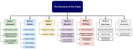 Figure 1 outlines the structure of the review paper, which is organized into five main sections. Section 1 serves as an introduction, offering an overview of LLMs, their historical development, related survey papers, and their role in facilitating hardware design and verification. Section 2 illustrates the methodology Preferred Reporting Items for Systematic Reviews and Meta-Analyses Extension for Scoping Reviews (PRISMA-ScR), which is followed by Section 3 discussing the main results of the methodology applied in this survey paper. Section 4 provides a detailed literature review, discussing the application of LLMs in hardware design, categorizing different hardware design and verification methods, and highlighting significant use cases and success stories. Section 5 focuses on the challenges associated with applying LLMs in this field, such as training difficulties, adapting to hardware-specific terminology, ensuring explainability and interpretability, and integrating these models with existing design tools. Section 6 explores open issues, including unexplored applications, research gaps, and the need for methodological improvements. Finally, Section 7 concludes the paper with a summary of the findings and offers implications and recommendations for future research. This structured framework ensures a comprehensive exploration of the role of LLMs in hardware design and verification while addressing critical challenges and opportunities.
