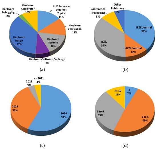 Figure 4 provides a comprehensive breakdown of the reviewed publications. In terms of research focus (Figure 4a), the majority (37%) addressed hardware design, with significant attention also given to hardware security (16%) and verification (13%), showcasing the wide applicability of LLMs across hardware domains. The distribution of publishers (Figure 4b) highlights that arXiv and IEEE Journals dominate with 37%, followed by ACM Journals (12%), reflecting a mix of preprints and peer-reviewed dissemination. These trends illustrate both the growing engagement with LLMs in hardware domains and the diversity of publication forums. The publication timeline (Figure 4c) indicates a rapid increase in interest, with 91% of studies published in 2023–2024. Finally, the authorship data (Figure 4d) reveal that 49% of the works were authored by 2–5 contributors, showing a collaborative trend, while 7% had solo authorship and 11% involved large teams of 10 or more.