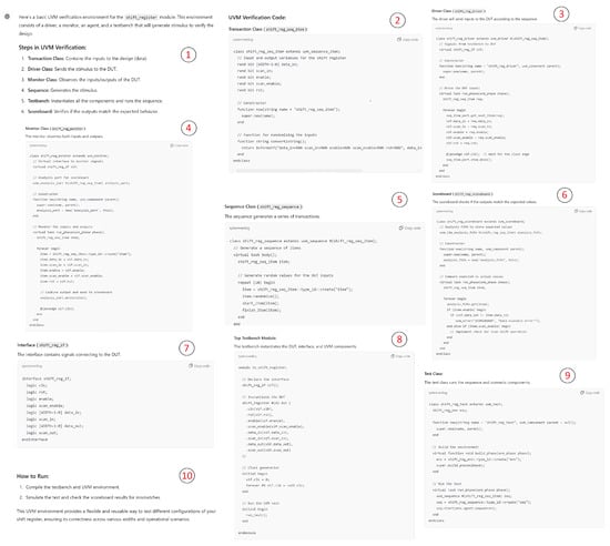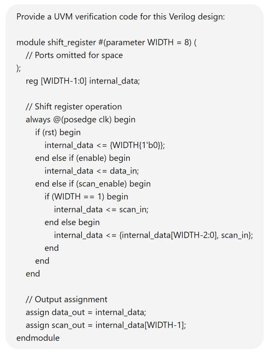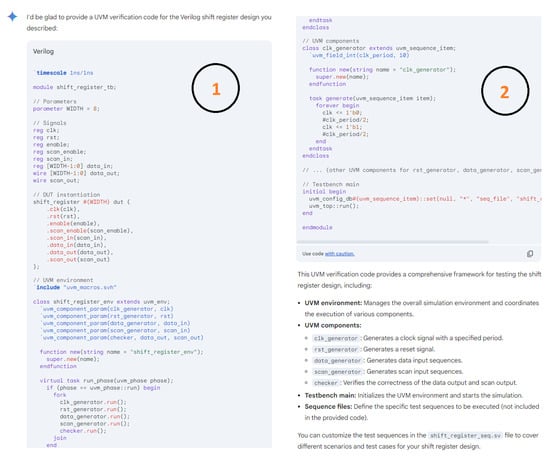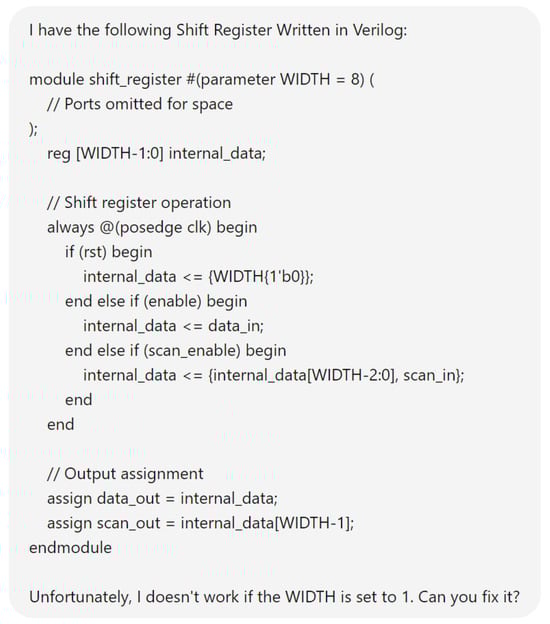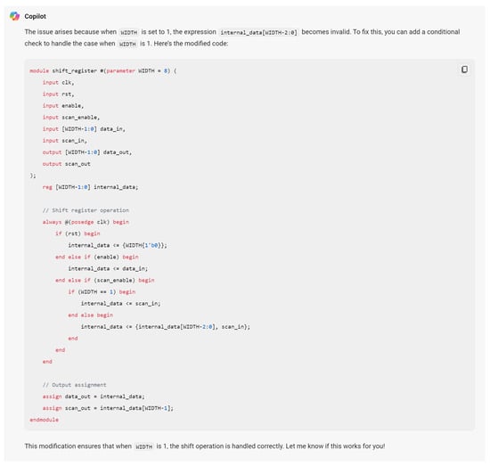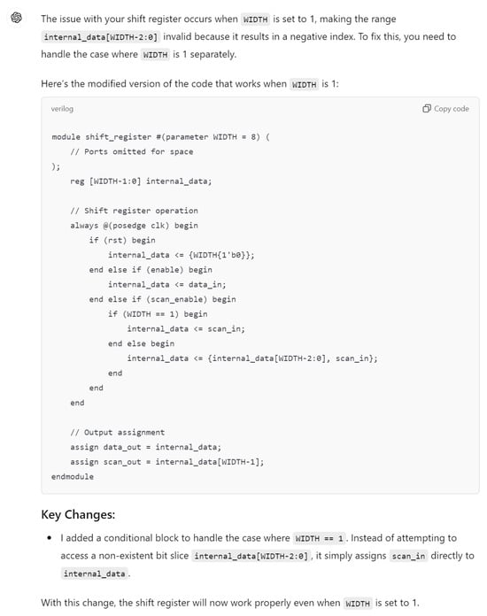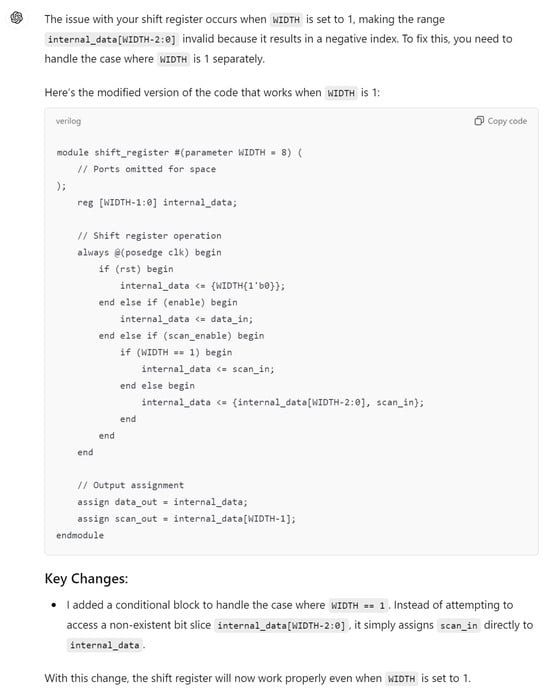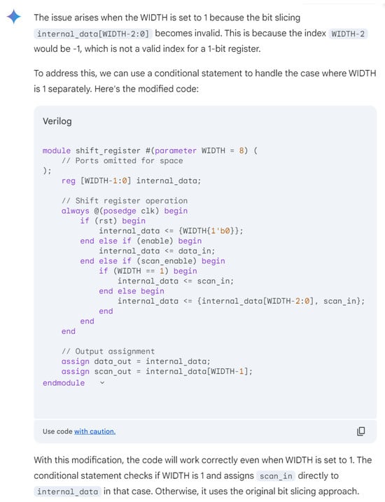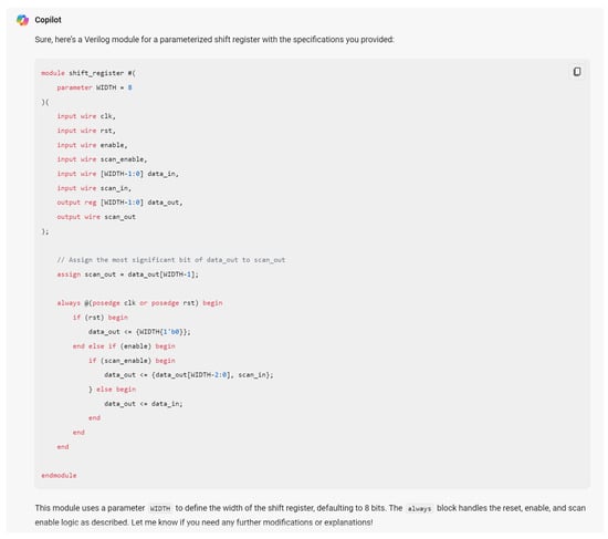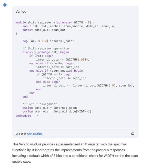 Hardware design using HDLs is evolving with the integration of LLMs such as OpenAI’s ChatGPT, Google Gemini, and Microsoft Copilot. These LLMs assist in modifying and generating HDL code by accepting design specifications as input prompts, streamlining the development process. In Figure 6, we demonstrate an HDL design for a shift register, where the input prompt describes the desired behavior and adjustments. The results of this input prompt processed by different LLMs are presented in Figure 7, Figure 8 and Figure 9, showing the outputs of ChatGPT 4o, Gemini, and Copilot, respectively. These figures illustrate the varying approaches taken by each model to interpret and modify the HDL design.