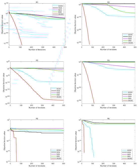 In addition, from the convergence curve graphs of these six test functions, it can be visualized that under the same initial conditions, the ISCSO algorithm reaches convergence significantly faster than the remaining algorithms, while the number of iterations required is also much smaller than that of the other four algorithms, especially when compared with the SCSO algorithm, which has the ability to attain a better global optimality search and jumping out of the local optimal solution, and its convergence effect has been significantly improved. It proves that the improvement strategy proposed in this paper has certain effects. The convergence curves of the algorithms under the six functions are shown in Figure 1 above.