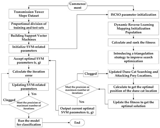 First of all, according to a certain proportion of the transmission, the tower slope data set is divided into a training set and a test set; at the same time, according to the life habits of a dune cat, we initialize the ISCSO algorithm and construct the initialized SVM model. Next, we use the dynamic reverse learning strategy to improve the diversity of the population, introduce the triangular wandering strategy to expand the range of dune cats’ searching and attacking prey, and constantly update the position of dune cats until the error accuracy meets the requirements. At this time, we output the optimal SVM parameters; after the SVM model obtains the optimal parameters, it starts to classify the dataset to obtain the optimal solution.