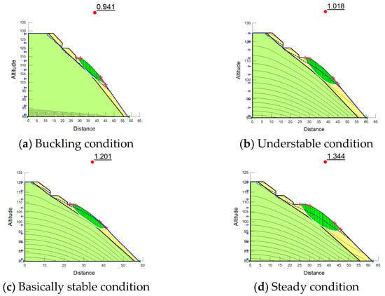In accordance with the guidelines for evaluating the stability of transmission tower slopes, the state of transmission tower slopes is categorized into four classes according to the safety coefficient of transmission tower slopes. When the safety coefficient is less than 1, the transmission tower slope is in an unstable state, and the safety grade is 1; when the safety coefficient is greater than or equal to 1 and less than 1.05, the transmission tower slope is in an unstable state, and the safety grade is 2; when the safety coefficient is greater than or equal to 1.05 and less than 1.25, the transmission tower slope is in a basic stable state, and the safety grade is 3; when the safety coefficient is greater than or equal to 1.25, the transmission tower slope is in a stable state, and the safety grade is 4. When the safety factor is greater than or equal to 1.25, the slope of the transmission tower is in a stable state, and the safety level is 4. At the same time, a part of the simulation calculation of each stable state of the transmission tower slope is displayed, as shown in Figure 3 above.