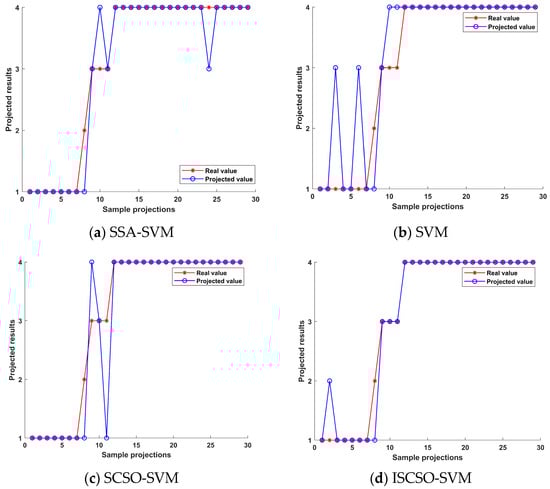 (a) Prediction results of SSA-SVM. (b) Prediction results of SVM. (c) Prediction results of SCSO-SVM. (d) Prediction results of ISCSO-SVM.