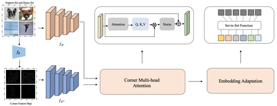 There is also a lot of work to further improve performance by leveraging the combination of pre-training and meta-training [21,22]. Based on the usability and effectiveness of the method above, we selected FEAT [14] as the baseline. In this paper, we use metric learning to solve the few-shot learning problem using corner features combined with a multi-head attention mechanism and embedding adaptive modules, which is the FSCA framework.
