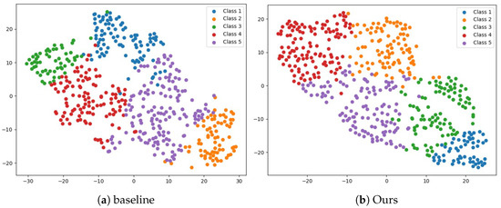 Visualization analysis. We provide visualizations to validate the distinctiveness of the representations generated via our framework for novel classes. Specifically, we randomly select five classes, each containing 100 images, from the meta-test set of miniImageNet. We then generate embeddings for all images using both the baseline and our framework (baseline + our method). We then use t-SNE [37] to project these embeddings into 2D space, as shown in Figure 5. The embedding distribution obtained through the baseline + our framework is more separable, with more precise and compact class boundaries between classes (see Figure 5a vs. Figure 5b). Visualization results demonstrate that our proposed framework produces more distinct and separable representations for new categories. This improved discriminability allows the model to better differentiate between classes, even with limited training data, leading to more accurate classifications of previously unseen categories. These results highlight the effectiveness of our framework in enhancing the ability of the model to generalize to new, unseen classes.
