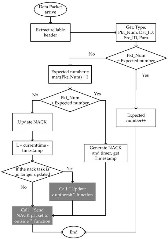 Figure 2 illustrates the internal data packet processing. In particular, this system includes a process for handling out-of-order packets. The method employed in this paper effectively reduces the occurrence of spurious retransmissions to some extent. The gray boxes in the flowchart provide further clarification of Algorithms 4 and 5 that we implemented.