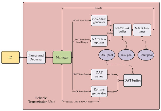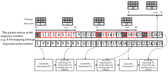 As shown in Figure 3, whether the message generation unit qualitatively confirms the processing description of data messages depends on the context. When the expected sequence number is greater than the packet number, a confirmation task for the retransmission range is created based on the actual situation. The sequence number of the mapping bitmap is 1–8 (with the start sequence number determined by the expected sequence number when the packet is created), and the timer is used to set the sending time. When the packet with seven serial numbers is received at the last update, the time difference for updating the sending time of subsequent negative acknowledgment packets is recorded. The actual mapping bitmap to be sent is determined using the previously set sending time through EWMA. For example, when packet 5 is received, the mapping bitmap in the negative acknowledgment packet is 00000110. That is, packets numbered 6 or 7 need to be retransmitted. Note that when a retransmission acknowledgment task is created, the expected sequence number must be outside the acknowledgment range of an existing task. Figure 3 shows the third build.