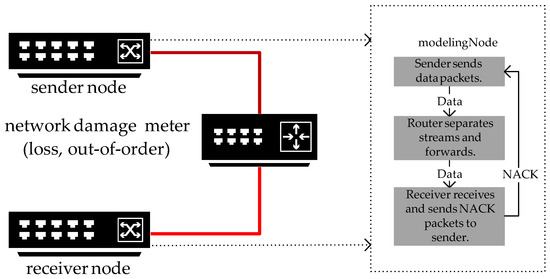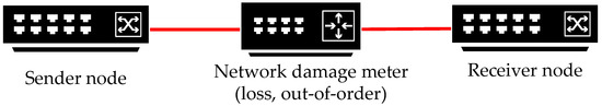The topology depicted in Figure 7 illustrates our simulation and experimental setup, where two nodes serve as the upstream and downstream entities, respectively. The two nodes are connected by a network impairment meter and configured with different parameters for out-of-order packets and packet loss damage. The network impairment meter is an abstract simulator that simulates out-of-order packets and packet loss in the network, and subsequent simulation parameters, such as packet loss rate and out-of-order degree, are configured by this impairment meter. This configuration forms the basis for our subsequent simulations and experiments, where we induced different degrees of reordering by manipulating the link parameters and setting specific packet loss rates using a network emulator.