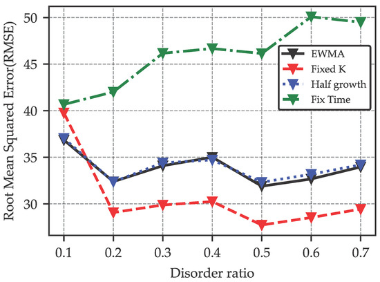 We compared several algorithms [20,22] for handling packets out-of-order packets under the same link conditions and evaluated their deviation from the actual waiting time using the Root Mean Square Error (RMSE). The Fixed K Algorithm 2 adjusts the value of K by either increasing or decreasing a fixed amount based on the previous calculation. Its advantage is its simplicity in computation, but the downside is its slow convergence, especially during sudden changes in link reordering. The Half-Growth Algorithm 3, on the other hand, converges more quickly to the actual situation by calculating the average, but it is susceptible to the impact of sudden changes, particularly during packet loss situations, where it may lead to an overestimation of the sending time due to prolonged transmission. In addition, there is a Fixed Time Algorithm that tolerates fixed sending times, meaning it does nothing to handle reordering. We perform a comparative study of these algorithms in Section 3.1.