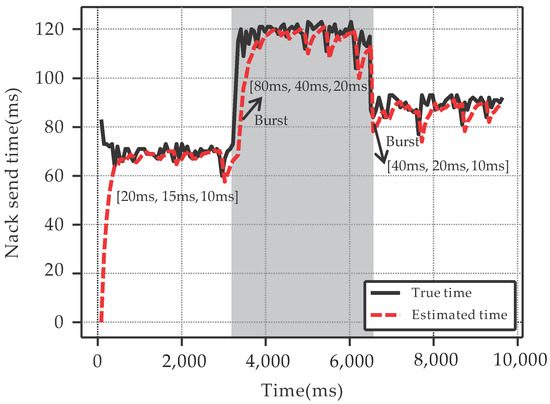 EWMA achieved better stability and a better fit and was more sensitive to changes in data. The fit of the Fixed K Algorithm relied heavily on the value of K, and the stability performance was poor. When the delay of each link was stable, the disorder also remained relatively stable. We set three different disorder conditions and simulated three aggregated links. The fitted curves are shown in Figure 11. The true time refers to the actual waiting time of this NACK, while the estimated time refers to the predicted time using the EWMA algorithm. It can be observed that this algorithm is capable of dynamically adjusting the sending time of NACKs.