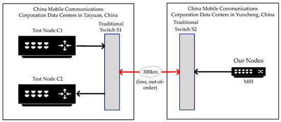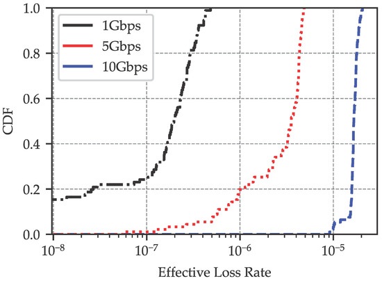 In addition, link corruption can significantly influence congestion control algorithms, ultimately affecting overall network performance. Traditional TCP congestion control mechanisms have predominantly been designed around loss-based strategies. This dependency can lead to a decrease in throughput, as packet loss and latency do not always correlate with actual network congestion levels. For example, under conditions where the link rate is 100 Mbps and the packet loss rate reaches , the throughput of TCP Westwood+ experiences a substantial decline of approximately 50%. In contrast, TCP NewReno and SACK (Selective Acknowledgment) exhibit only a 10% reduction in throughput under the same network conditions [6]. There are also some congestion control mechanisms based on delay or explicit congestion notification [7]. But in wide-area network communication across data centers, the traffic is often a mix of flows. Due to the heterogeneity of the data, methods based on network measurement (ECN or delay) may not be suitable [8]. In this case, the network still needs to rely on packet loss to detect congestion, which further increases the demand for network quality.