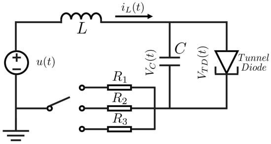 Taking the modeling of a Tunnel Diode circuit (Described in Figure 1) into consideration, assume that the resistor switching behavior can be consistent with the Markov process . Then, the following system dynamics can be derived according to the Kirchoff current law: