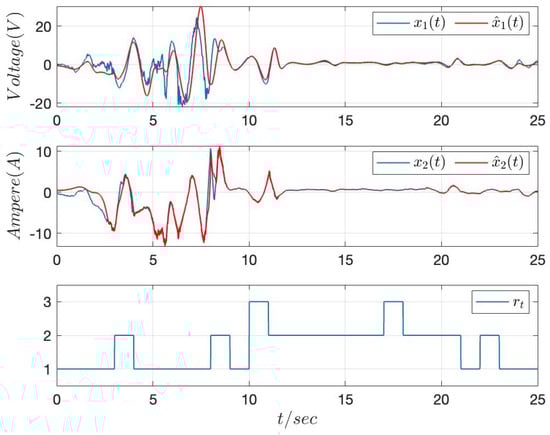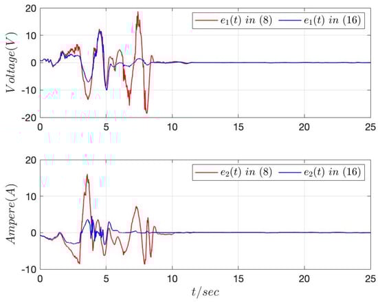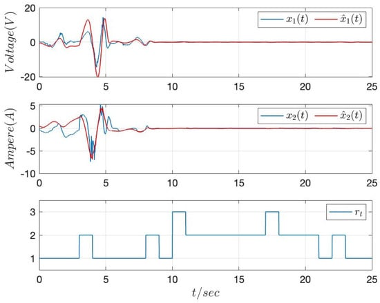 Choose the initial conditions , where , and , , , , . Meanwhile, choose scalars , , , , , . Then, the simulation outcomes are depicted in Figure 2, Figure 3 and Figure 4. Figure 2 plots the state responses of and in the closed-loop system with the adaptive controllers (24) and (25) under the same individual jump mode , respectively. The curves of and are offered in Figure 3. Meanwhile, the adaptive sliding mode controller and its estimated parameters for , , , , and are exhibited in Figure 4. To demonstrate the advantages of the dual SMC approach, simulation results are derived for error dynamics (8) in a scenario without control. These results are compared with the error SMD (16) obtained by SMC. As seen from Figure 5, the state properties of the error SMD (16) are superior to those of error dynamics (8) in both transient and steady-state behavior. This indicates that the dual SMC approach ensures faster and better convergence. Furthermore, a comparative study was conducted with traditional state feedback control without switching signals. The simulation results, as depicted in Figure 6, demonstrate the superior system performance achieved by the SMC method. Above all, it is known that the proposed adaptive SMC strategy is effective and feasible.