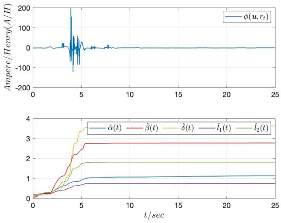 Letting , then , , . The unknown nonlinear functions are given by , , and . The exogenous disturbance is chosen as . According to Theorem 1, let , by solving the LMIs (19) with MALAB LMI Toolbox, one can acquire the following solutions: