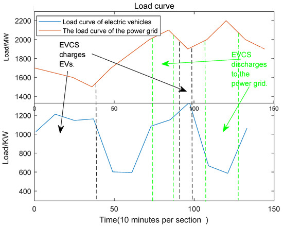 Through the EVCS model constructed in Section 1 and the Poisson distribution adhered to by the number of EVs and the normal distribution followed by the charging time of EVs, it can be observed from the aforementioned figure that the troughs of the original daily load curve of EV charging occur from 7:00 to 12:00 and from 18:00 to 21:00; the peaks are, respectively, from 13:00 to 16:00 and from 22:00 to 5:00 of the next day. After 21:00, the load curve begins to exhibit an upward trend. The peak and trough times of the power grid and the load are presented in Table A1 and Table A2. Through Matlab simulation, a comparison diagram of the daily load curve of the power grid and EVs is obtained, and the results are as follows: