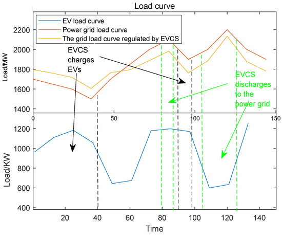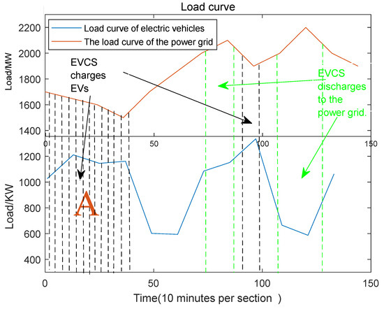 In Figure 3, the trough of the daily load curve of the power grid and the peak of the daily load curve of EVs lie within the dotted area indicated by the black arrow, while the peak of the daily load curve of the power grid and the trough of the daily load curve of EVs are encompassed within the dotted area indicated by the green arrow. This implies that the peak electricity consumption time of EVs exhibits a complementary tendency with the electricity consumption peak of the power grid. Hence, this trend can be exploited to reduce the peak–valley difference of the power grid load through an effective charging and discharging scheme of EVCSs.