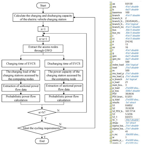 However, conducting only one segmentation might result in certain deviations. Hence, through a large number of cycles, the most reasonable optimization scheme is selected from the data after the cycles. This scheme can greatly minimize the error and be closer to the actual situation. The probabilistic power flow calculation of the distribution network with EVCS and taking into account its charging and discharging capacity is presented in Figure 5.