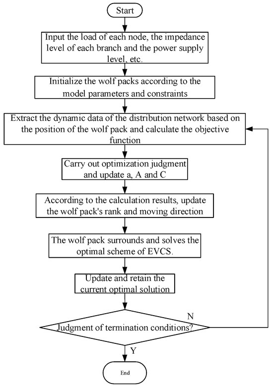 where Sm_CS denotes the attractiveness of the m-th charging station to EV users. The charging range of EVCSs is preferably larger. In this paper, the planning scheme will be solved by means of GWO. To adapt to the algorithm rules, S5 represents the reciprocal of the charging range of EVCSs, that is, the smaller S5 is, the larger the charging range. The attractiveness of the m-th charging station to EV users is presented as follows: