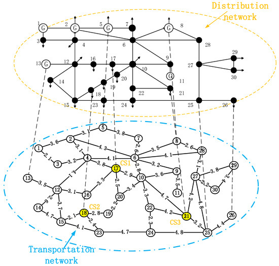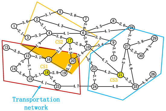 - Constraints regarding the number of charging stations:where ni_EVCS represents the number of EVCSs at node i. During the planning process, only one EVCS can be constructed at each road network node.