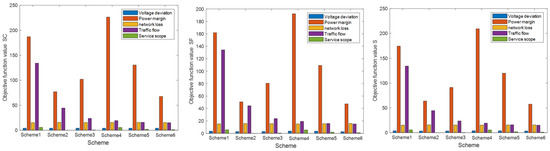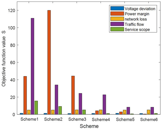 where SC and SF represent the target items addressed by the EVCSs at the charging and discharging instants. S1, …, S5 are the sub-targets considered in each target item, and ultimately, they are planned to be solved as a single target through Formula (8). k1, k2, …, k12 are the proportion coefficients of the sub-targets in the total target, and ac and af are the weight coefficients, signifying the proportions of the objective functions at the charging and discharging instants in the total objective function, respectively, which can be adjusted based on actual requirements. S1, S2, S3, S4, and S5, respectively, denote the voltage deviation of the bus node, the active power margin level of the AC line, the network loss level of the entire network, the traffic flow, and the service range of the charging station, and S is the objective function after considering the charging and discharging capabilities of the EVCS.
