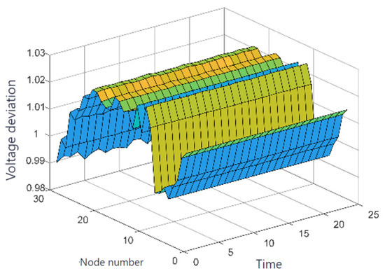 According to the multi-objective optimization scheme proposed in Section 2, it is necessary to extract the power flow data of the distribution network after accessing the EVCS. In real life, the power flow data of the distribution network are constantly changing. If calculated based on the traditional deterministic power flow, there will be a certain deviation from the actual result. In this paper, the dynamic data of the distribution network is extracted by solving the tidal current in various time periods, and the results are presented in Figure 4 as follows: