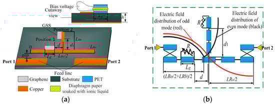 For example, the properties of of graphene ink, including omnidirectional resistance and easy printing, make it particularly suitable for the design of absorbers with periodic structures [6,7,8] and multi-way dividers [9]. Multilayer graphene films, through high temperature annealing and rolling, and with their high conductivity and flexibility, are ideal for the design of pressure sensors [10] and wearable antennas [11]. In addition to the above materials, graphene-based materials with controllable electrical conductivity have recently become an area of high research interest. Both few-layer graphene flakes and graphene nanoplates have controllable conductivity and small sizes, which make them suitable for the design of tunable attenuators [12,13,14,15] and reconfigurable antennas [16]. However, tunable devices based on graphene nanoplates always require additional bias circuits, which make it difficult for them to be applied in the design of multifunctional devices. Graphene-sandwiched structures (GSSs) are a kind of graphene-based material processed from two monolayers of graphene and ionic liquid; they have controllable conductivity and can be used for the design of tunable attenuators [17,18,19,20]. The surface resistance of GSSs can be controlled only by applying a vertical voltage on the two monolayers of graphene. Thus, GSSs are well suited for the design of integrated devices. For example, by loading GSSs on a spoof surface plasmon polariton (SSPP) transmission line with a low-noise amplifier (LNA) chip, a dynamically tunable integrated device for attenuation, amplification and transmission can be designed [18]. Since no additional bias circuit is required, the loading of the GSS does not affect the operation of the LNA.