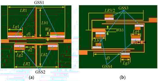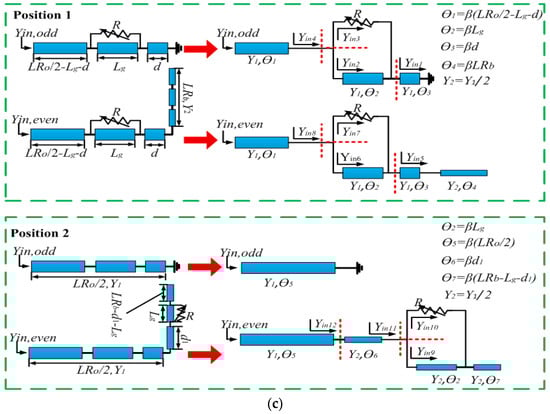 The geometry of the GSS-loaded open-ended resonator with a centrally loaded open stub resonator is exhibited in Figure 1a. The GSS is loaded on position 1 (Where the GSS is loaded on the open-ended resonator) or position 2 (where the GSS is loaded on the open stub) to influence the resonant characteristics of this resonator. When the GSS is loaded on position 1, d represents the distance between the GSS and the center of the open-ended resonator. When GSS is loaded on position 2, d1 represents the distance between the GSS and the beginning of the open stub. Lg and Wg are the length and width of the GSS. All the parameters are given in Table 1. Figure 1b depicts the equivalent circuit of the GSS-loaded open-ended resonator with centrally loaded open stub dual-mode resonators, which can be analyzed by the odd–even mode method. Figure 1c shows the disassembling diagram of Figure 1b, when the GSS is loaded on position 1 or position 2. Then, the influence of loading the GSS on the dual-mode resonator can be theoretically analyzed by calculating the input admittance of the odd–even mode resonant structure. When the GSS is loaded on position 1, the input admittance of the odd mode and eve -mode can be calculated by Equations (1)–(3) and (4)–(6), respectively.