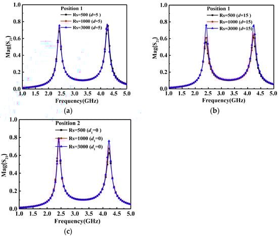 The relationship between Rs and the transmission coefficient of the GSS-loaded open-ended resonator with a centrally loaded open stub: (a) position 1, d = 5; (b) position 1, d = 15; (c) position 2, d1 = 0.