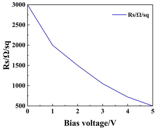 According to Equations (1)–(6), the surface resistance of the GSS has no effect on the imaginary part of input admittance but has a great influence on the real part. Similarly, the same method can be used to calculate the odd–even mode input admittance when the GSS is loaded on position 2. The calculation results are given in Equations (7)–(10), and the same conclusion can be drawn. Figure 2 presents the full-wave simulation results of the GSS-loaded open-ended resonator with a centrally loaded open stub. These results not only validate the calculation results but also provide insights into the impact of graphene loading on the dual-mode resonator. As can be seen from Figure 2, when the GSS is loaded on position 1 and d = 5 mm, graphene can attenuate the resonance intensity of the odd mode but has a little influence on the even mode. When the GSS is loaded on position 1 and d = 15 mm, graphene can attenuate the resonance intensity of both the odd mode and even mode. When the GSS is loaded on position 2 and d1 = 0 mm, graphene can attenuate the resonance intensity of the even mode but has no influence on the odd mode. Moreover, when graphene can effectively attenuate the resonant mode, the smaller the surface resistance of the GSS, the bigger the attenuation amplitude. The surface resistance of the GSS is modulated by the bias voltage on its surface. As seen in Figure 3, the graphene surface resistance decreases with increasing bias voltage. Therefore, we can draw the following conclusions: the effect of graphene on the resonator is related to the electric field distribution of the resonant mode, and for the GSS-loaded open-ended resonator with a centrally loaded open stub, the resonance intensity of both modes can be controlled independently and flexibly by changing the loading position and surface resistance of the GSS.