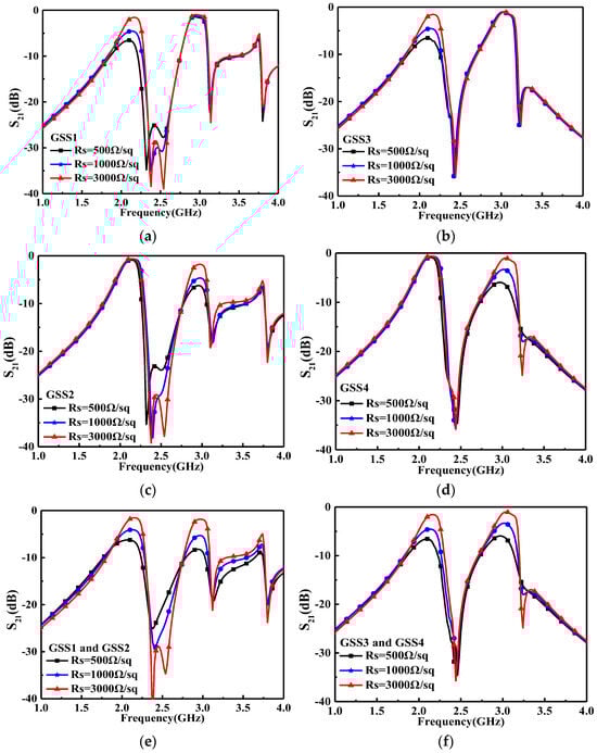 The simulation results of tunable dual-band filtering attenuators I and II. (a) Control of the surface resistance of GSS1; (b) control of the surface resistance of GSS3; (c) control of the surface resistance of GSS2; (d) control of the surface resistance of GSS4; (e) control of the surface resistance of GSS1 and 2; (f) control of the surface resistance of GSS3 and 4.
