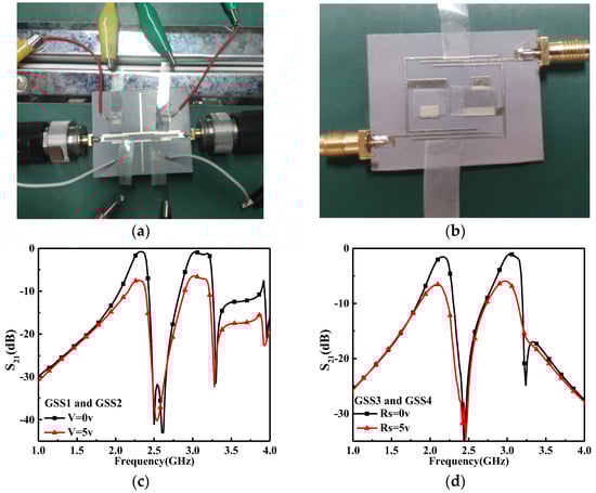 In order to verify the design of tunable dual-band filtering attenuators, two prototypes are fabricated and measured. The whole circuit is implemented on F4B substrate with a dielectric constant of 2.2 and a thickness of 1 mm, as shown in Figure 6a,b. Meanwhile, the measured results of these attenuators are shown in Figure 6c,d. According to the results, by applying a bias voltage of 0–5V to the GSSs loaded on these attenuators, the two dual-band filtering attenuators achieve attenuation ranges of 1.7–7.9 dB, 1.6–7.2 dB, and 1.8–7.5 dB, 1.3–6.9 dB in their corresponding passbands. The measured results achieve good attenuation control, which can not only verify the design principle but also demonstrate the characteristics of a GSS-loaded open-ended resonator with a centrally loaded open stub. Table 3 shows a comparison between the tunable dual-band filtering attenuators, and the proposed work.
