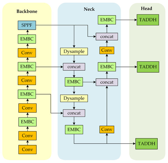 Specifically, the EMBC module leverages a refined Squeeze-and-Excitation (ESE) attention mechanism to supplant the conventional C2f module, thereby mitigating the channel information loss during feature extraction and bolstering the model’s generalization capabilities. Moreover, the DySample upsampler addresses the shortcomings of the traditional nearest-neighbor interpolation method in handling diminutive targets and occlusion challenges through its dynamic sampling point generation strategy, leading to enhanced feature extraction accuracy and resource utilization. Finally, the TADDH detection head optimizes the alignment of the classification and localization branches while reducing the number of model parameters, resulting in more efficient object detection.