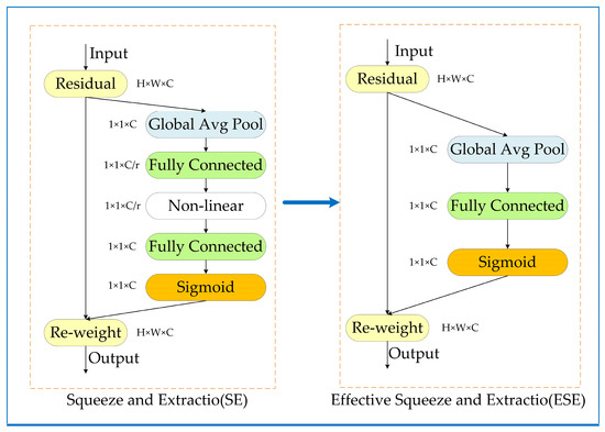 The image illustrates that, initially, the module increases the channel dimensions of the input feature map using a 1 × 1 convolutional layer. It then proceeds to the depthwise separable convolution part for feature extraction. Subsequently, the Squeeze-and-Excitation (SE) module improves the model’s representational power by explicitly modeling the relationships between the feature channels, allowing it to enhance the important features while suppressing the less significant ones. Following this, a 1 × 1 convolutional layer compresses the number of channels. Finally, a residual connection is applied to mitigate the vanishing gradient problem in deep networks and accelerate the model’s training process. The MBConv module employs depthwise separable convolutions and a linear bottleneck structure to effectively minimize the model’s parameters and computational burden, all while preserving a strong feature extraction performance. In MBConv, the SE module, as an effective attention mechanism, originally comprises two fully connected (FC) layers, which play the roles of reducing and expanding the feature channel dimensions, respectively. However, while the dimension reduction operation helps in decreasing computational complexity, it inevitably leads to a certain degree of information loss across the channels. To further enhance the effectiveness of feature extraction, Effective Squeeze-Excitation (ESE) is introduced. The core idea of ESE is to streamline the traditional two FC layers into one, thereby better preserving the integrity of the information among the channels without undergoing explicit dimension reduction. The specific changes are illustrated in Figure 3.