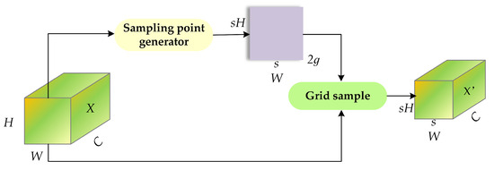 The grid sample function utilizes the positions in S to resample the input feature map X, resulting in a new feature map X′ of the size C × sH × sW. This process can be expressed as follows: