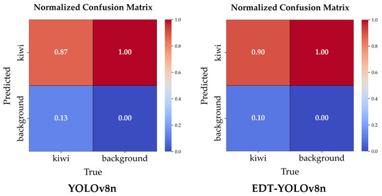 The confusion matrix results for the EDT-YOLOv8n and YOLOv8n are shown in Figure 6. The confusion matrix provides a clearer reflection of the correspondence between the actual and predicted classes. In the figure, the rows of the matrix correspond to the actual categories, whereas the columns correspond to the predicted categories. The values in each cell represent the proportion of samples predicted to belong to a specific category and that genuinely belong to that category. From the figure, it can be seen that the precision of EDT-YOLOv8n is 90%, which is higher than YOLOv8n’s 87%, indicating a greater detection accuracy in the identification of kiwis.