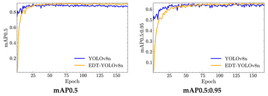 Additionally, we analyzed the changes in mAP0.5 and mAP0.5:0.95 during the training process. As shown in Figure 7, it is evident that the mAP0.5 and mAP0.5:0.95 of EDT-YOLOv8n exhibit significantly better performances compared to YOLOv8n throughout the training period.
