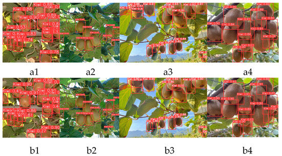 To visually demonstrate the detection performance of the proposed algorithm, the images from the dataset were processed using both the YOLOv8n and EDT-YOLOv8n models. Figure 8 shows some of the detection results. The first row displays the detection results from the YOLOv8n model, while the second row shows the results from the EDT-YOLOv8n model. From the figure, it can be observed that in Figure 8a1, a kiwifruit in the top left corner was missed, and a kiwifruit below it, which was partially occluded by a calyx, was also not detected. In Figure 8a2, a kiwi obscured by leaves was not detected. In Figure 8a3, a leaf in the upper left corner was incorrectly identified as a kiwi, and two overlapping kiwis were falsely detected as three. In Figure 8a4, a kiwi in the far-left area that was partially obscured was missed.