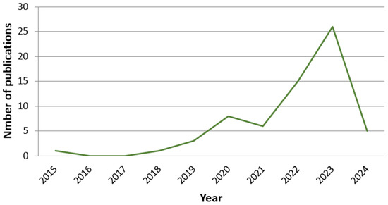 This search returned 70 documents. Figure 1 illustrates the total number of published works on the subject per year from 2015 to 2024, covering nearly a decade. Studies began modestly in 2015 and remained stable until 2018. Between 2018 and 2020, the number of publications increased significantly, followed by a minor decline in 2020–2021. From 2021 onward, a significant upward trend is observed, peaking in 2023.
