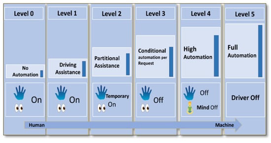 Figure 8 provides a summary of the key content in this section. Figure 9 clarifies the different levels of autonomous driving, clarifying specifically the detail of intervention required with automotive vehicles. These levels are described as follows: Autonomous vehicles are categorized into six distinct levels ranging from 0 to 5, each representing different levels of self-driving technology they possess, as illustrated below.