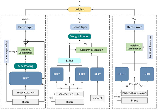 Pretrained models for AES use large language models to automatically represent and extract features from articles. They only require a simple classifier to complete the output [7,14]. Currently, most of these methods use BERT as the baseline model and add new techniques and frameworks, or they employ different fine-tuning approaches to improve performance. Some of these studies have already surpassed deep neural network-based methods [8,15]. Cao et al. [15] employed two self-supervised tasks and domain adversarial training, while Yang et al. combined regression and ranking to train their model [8]. Automated essay scoring across different prompts is currently a hot research topic. Wang et al. [16] explored unsupervised model training by aggregating heuristic signals, while Jiang et al. [17] used Dissented Representation Learning to enable the model to master inference prompts on its own. Recent studies have also begun to the attempt automatic scoring of articles based on multiple traits, such as using the generative model to evaluate articles on multiple traits by providing sentences as additional hints [18]. However, most of these studies still considered the essay as a whole, ignoring the differences of the criticality of different parts. We selected three models for comparison and present them in Table 1.