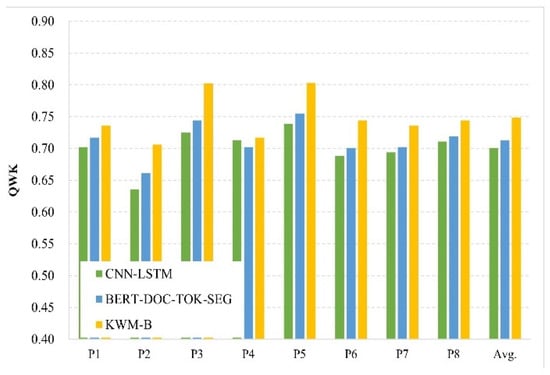 In our previous experimental results, we observed that the KWM-B framework performed exceptionally well in scoring argumentative essays on the ASAP dataset. Based on this, we evaluated our model’s performance on another dataset, TOEFL11 [27]. The TOEFL11 dataset consists of 12,100 essays sampled from eight prompts and scored at three levels (low/medium/high). All these essays are argumentative, which better aligns with our analysis objectives.