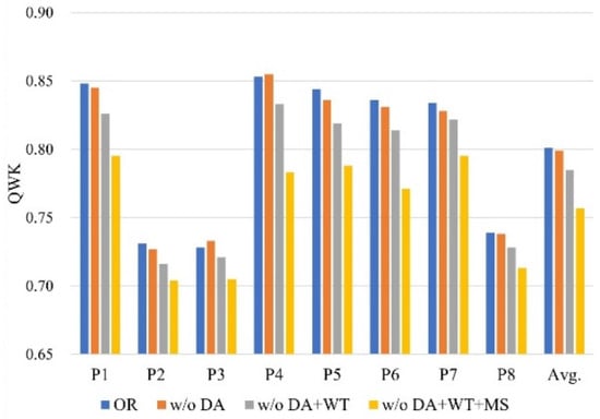 The experimental results are shown in the Figure 3. In Figure 3, the OR represents the QWK value of the complete KWM-B framework, and then we gradually removed each feature module in the framework. DA is the data augmentation technique, WT is the weighting process, and MS is the multi-scale representation.