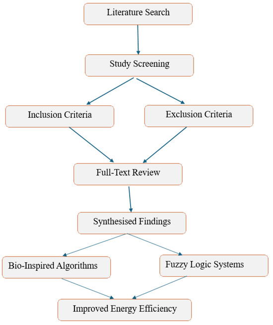 Figure 2 illustrates the step-by-step review process for integrating bio-inspired algorithms and adaptive fuzzy logic systems in IoT architectures. An extensive literature search was conducted to capture relevant studies on IoT energy efficiency. Keywords and phrases were chosen based on an initial literature exploration, focusing on critical areas such as energy-efficient communication protocols (e.g., CoAP, MQTT), routing strategies, resource allocation, and optimisation algorithms. Boolean operators and exact phrase matching were used to ensure relevant and specific results.